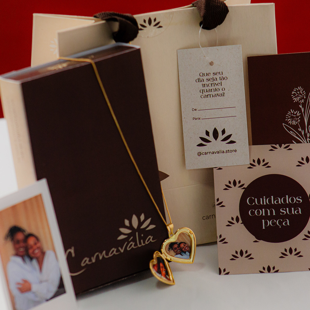 O nosso Kit Relicário Dourado + Polaroid é o presente perfeito! O kit possui um colar relicário (disponível em 4 formatos), 2 fotinhas para colocar no pingente do colar, uma foto polaroid. Tudo isso dentro da caixinha linda da Carnavália junto com os nossos postais! Após concluir a compra, mande as fotos para o nosso WhatsApp !
